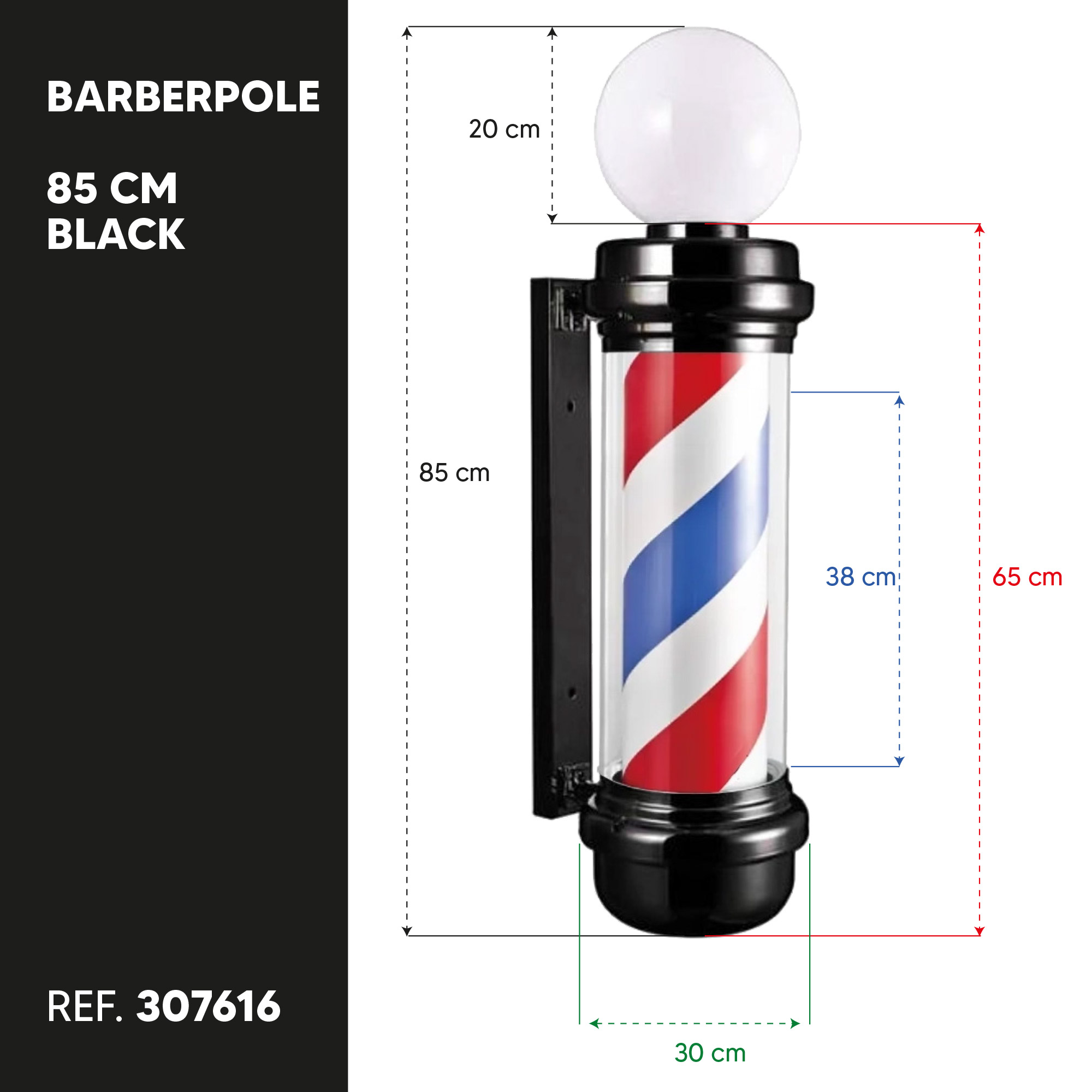 Barberpole - Kapperspaal met Bol 85cm - Zwart